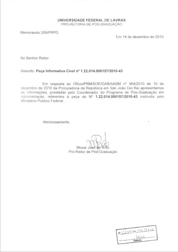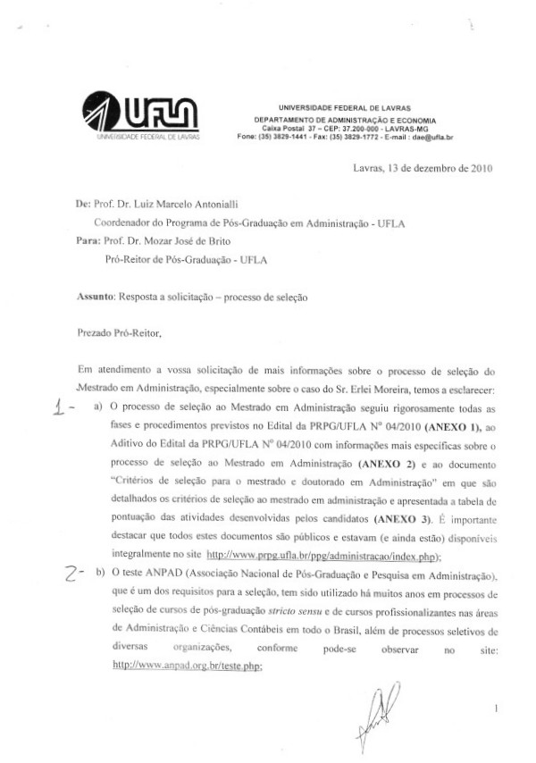 em 5º lugar entre os 11 selecionados. Abaixo a Tabela Oficial da UFLA, datada de 26/11/2010, relacionando os aprovados: