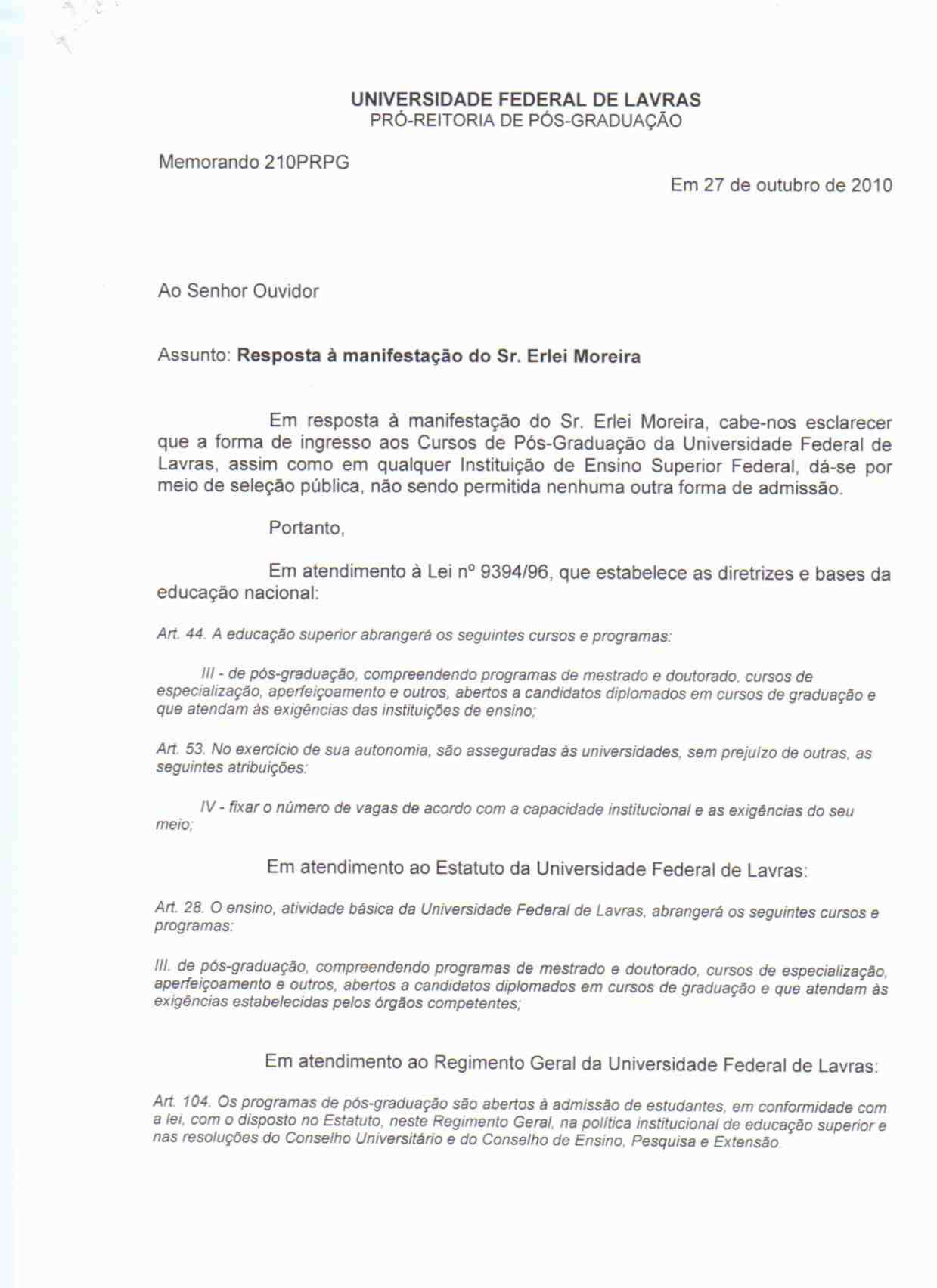 Pró-Reitoria de Pós-Graduação e o e-mail de 12/11/2010 da Ouvidoria me